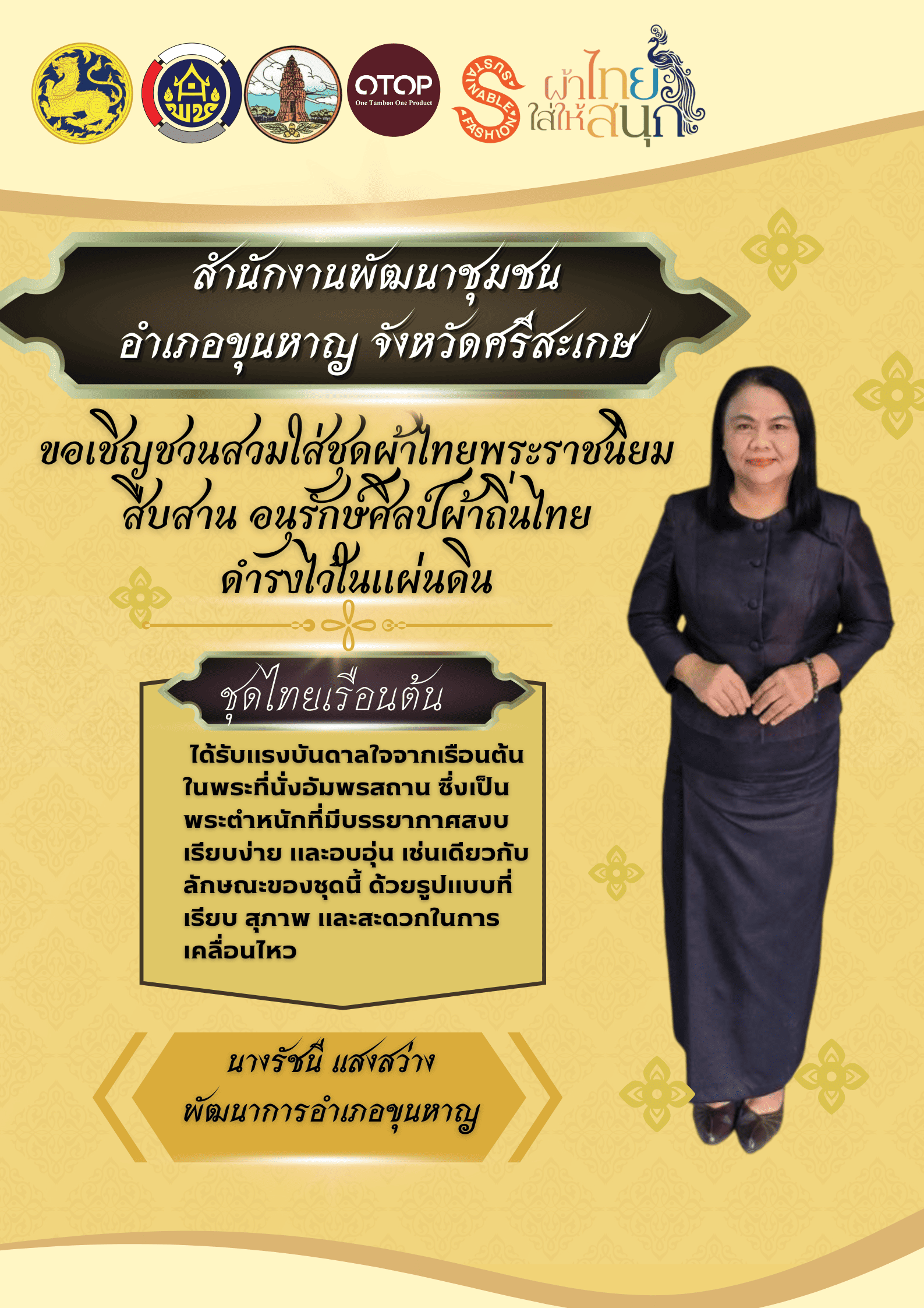 นางรัชนี แสงสว่าง พัฒนาการอำเภอขุนหาญ จึงขอเชิญชวนสวมใส่ชุดไทยพระราชนิยม มรดกแห่งความภาคภูมิใจในความเป็นไทย น้อมรำลึกในพระมหากรุณาธิคุณของสมเด็จพระนางเจ้าสิริกิติ์ พระบรมราชินีนาถ พระบรมราชชนนีพันปีหลวง สืบสาน อนุรักษ์ศิลป์ผ้าถิ่นไทย ดำรงไว้ในแผ่นดิน โดยชุดที่สวมใส่ดังภาพข้างต้นนั้นเป็นแบบชุดไทยเรือนต้น